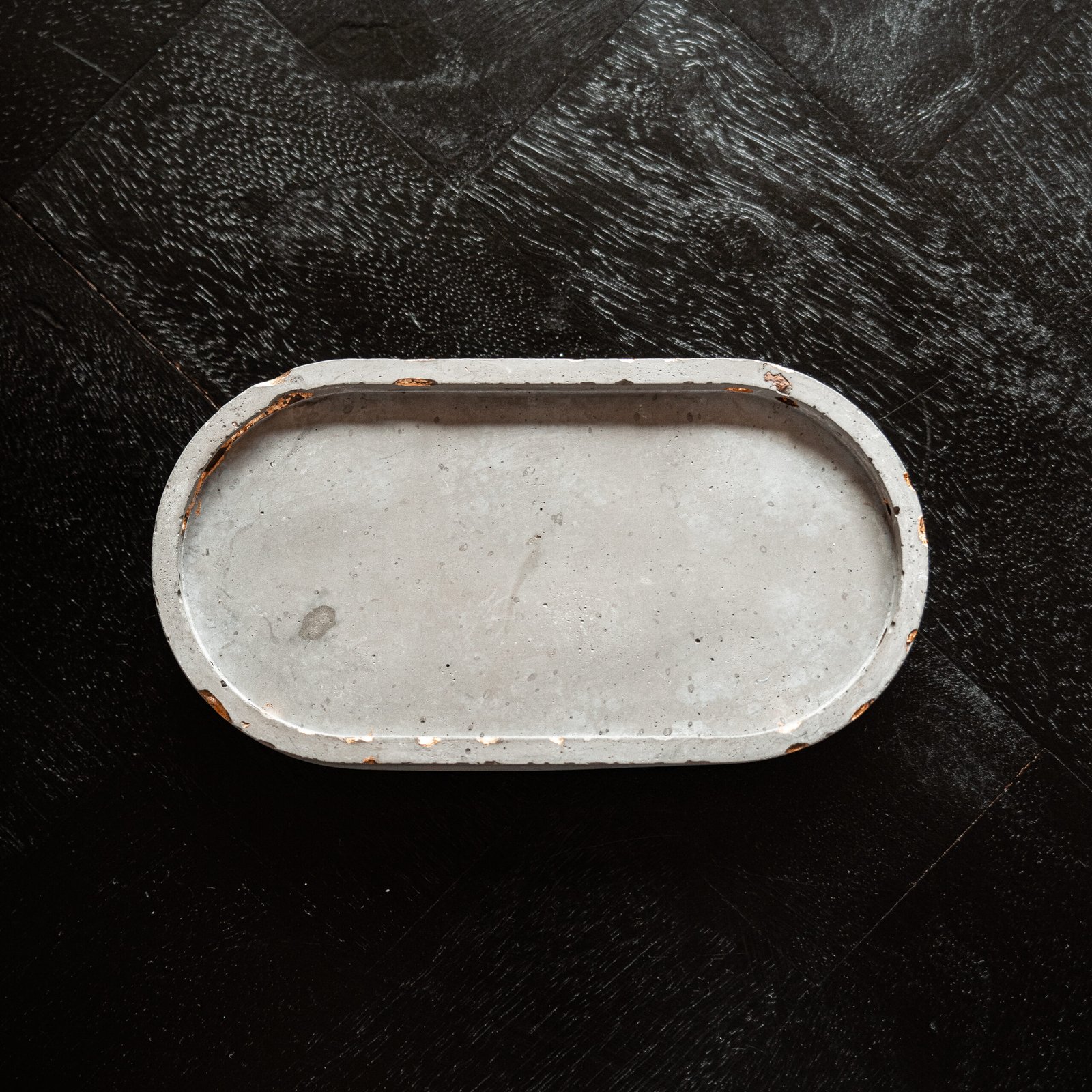 Onze grijze betonnen tray is een modern, handgemaakt item met subtiele bladgouden accenten die een warme touch geven aan het industriële design. De ruwe textuur en het ambachtelijke karakter maken dit een echte eyecatcher. Elke tray is uniek, met natuurlijke imperfecties die het ambacht weerspiegelen.
