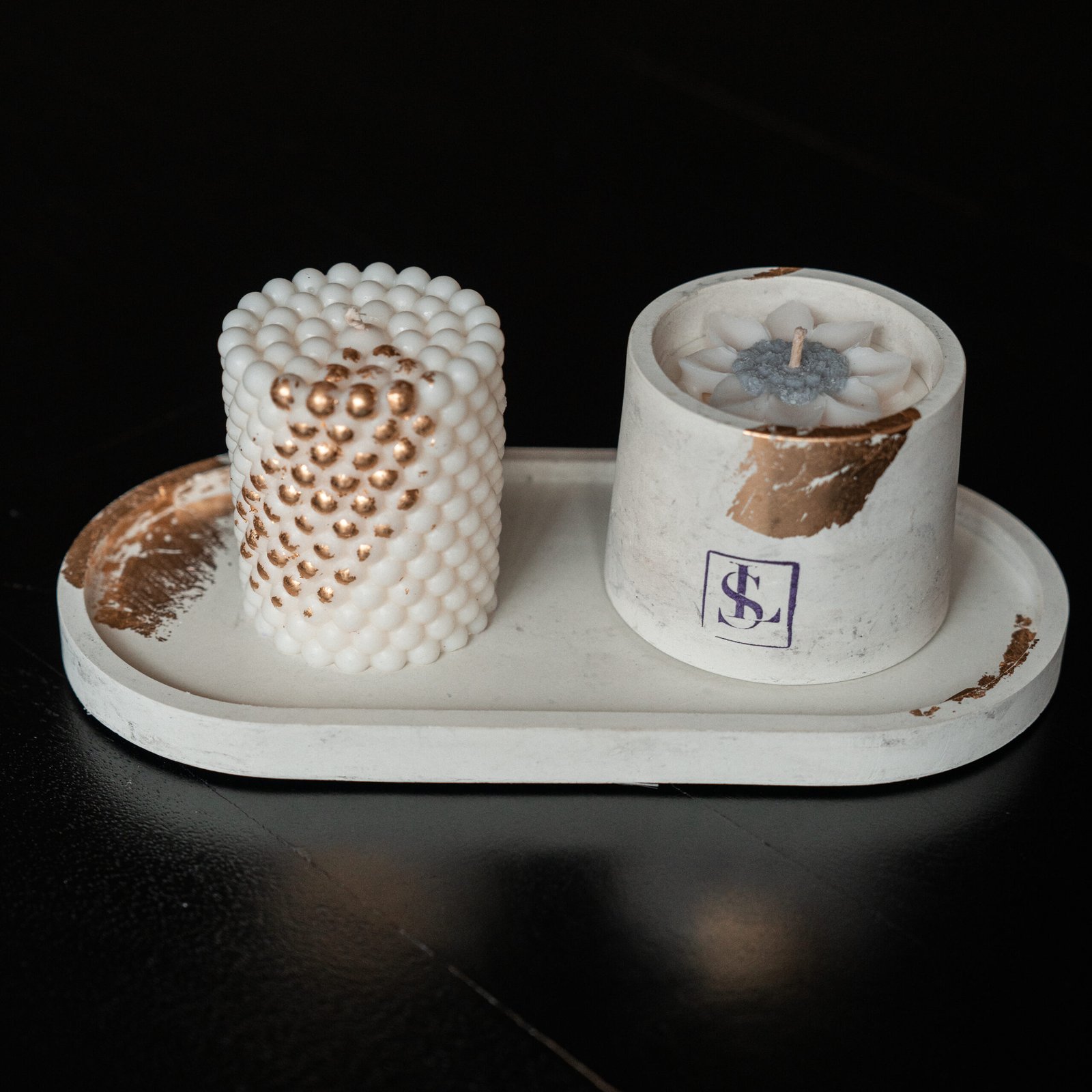 Onze handgemaakte betonnen kaarsenset combineert minimalistisch design met praktische elegantie. De set bestaat uit een stevige betonnen pot en bijpassende tray, afgewerkt met subtiele goudaccenten. De bijgeleverde kaarsen zijn handgegoten met 100% natuurlijke sojawas en een katoenen lont – goed voor een schone, langdurige verbranding.
